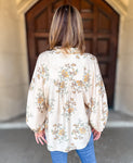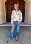 Feminine and versatile, this floral print blouse features long peasant sleeves with button cuffs and a classic collared neckline. The button-front design and round hem create a timeless silhouette, while the soft rayon-nylon blend in a light ecru makes it easy to dress up or down for any occasion.