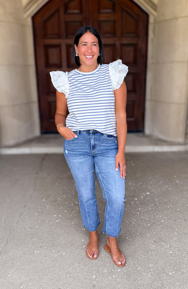 Introducing our versatile and stylish Harriet Striped Ruffle Sleeve Top, perfect for any occasion. The round neck and colorblock design on the yoke...