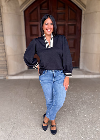 The Heidi 3/4 Balloon Sleeve Mixed Media Top is a perfect blend of comfort and style. This chic blouse features a classic crew neckline and a loose...