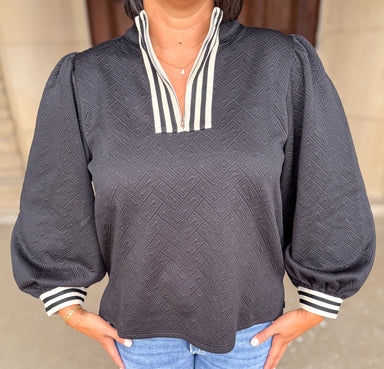 Introducing the Evelyn Textured Contrast Zip Top, where classic design meets modern flair. This top features a textured pattern that instantly elev...