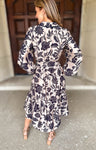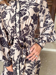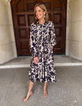 A soft, feminine take on a timeless silhouette, this floral print midi dress features a collared neckline, button-front design, and delicate scallop trim for a charming touch. The elastic waist with a tie belt flatters the figure, while long sleeves with banded cuffs add a polished finish. Crafted from a lightweight blend in a warm oatmeal hue, it’s perfect for both casual outings and dressier days.