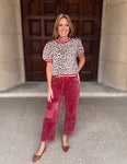 Easygoing with a touch of structure, these washed corduroy barrel pants feature a flattering high waist with belt loops and a drawstring finished with metal eyelets for added detail. Designed with a relaxed fit, stretch for comfort, and subtle seam details, they’re both stylish and functional. Finished with front and back pockets and an ankle-length cut for versatile wear. Crafted from a soft cotton-blend corduroy in a rich red velvet hue.
