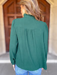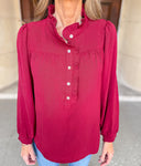 Don't miss out on our newest blouse! Demi is a chic, stylish piece featuring a button-up mock neck adorned with delicate ruffle trim. Subtle gathering across the front and back adds a touch of unique charm, while ruching at the shoulders and a loose, draped fit create an effortlessly elegant silhouette. Demi is the perfect wardrobe staple!