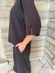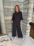 Effortlessly comfortable relaxed-fit set featuring a crew neckline top with 3/4 raglan sleeves and split band cuffs, crafted from mediumweight stretch fabric for all-day ease. Paired with wide-leg pants designed with a wide flat waistband and side pockets for a flattering, laid-back silhouette.