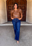 Edgy meets feminine in this faux leather top, designed with a split V-neckline and short puff sleeves. Subtle pintuck detail at the cuffs adds a tailored touch, while the sleek caramel finish brings modern appeal. Crafted from a luxurious faux leather blend, it offers structure with a soft feel, perfect for casual outings and sophisticated evenings.
