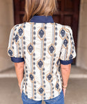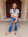 Beautifully detailed, this top features intricate embroidery in navy accents with contrast trim and a flattering split-V neckline. Short puff sleeves with band cuffs add a feminine touch, while the lined design ensures all-day comfort and a polished finish.