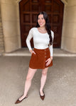 A playful twist on a classic, this corduroy skort features a wrap-around button-front skirt layer with the ease of shorts. Designed with side and back pockets, belt loops, and an elastic back waistband for a comfortable fit, it combines function with style. Finished in a versatile brown hue and crafted from 100% cotton, this piece is perfect for effortless everyday wear.