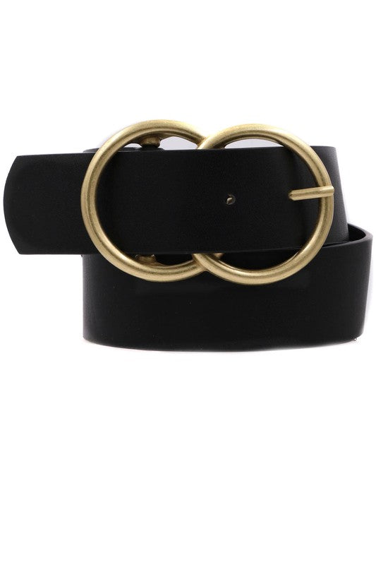 Vegan Leather Belt width: 1.25" Buckle length: 2.5" Polished gold buckle finish Belt length: 41" Adjustable One Size
