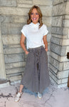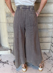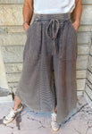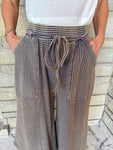 Washed striped panels bring a laid-back, textured feel to these Amaya Washed Striped Palazzo Pants. Designed with a relaxed fit, they feature a comfortable wide elastic waistband paired with a removable tie belt for adjustable styling. Patch pockets and a single back pocket add practical charm, while the angled hem on the wide leg pants gives the silhouette a modern, effortless finish.