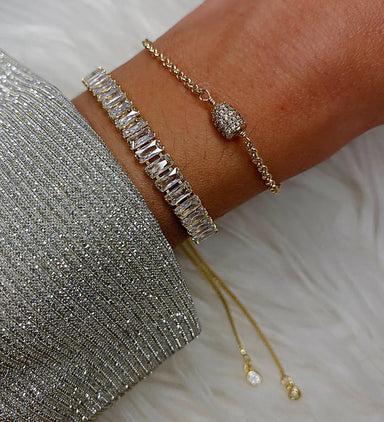 Slip into luxury with this dazzling pull chain bracelet, where geometric cubic zirconia baguettes sparkle against rich gold plating. The clever pul...