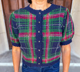 Sweet and stylish, this Jenna Plaid Scallop Cardigan features short puff sleeves and scalloped edges for a feminine touch. The button-front design and medium-weight knit make it perfect for layering through the seasons.