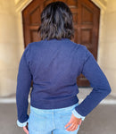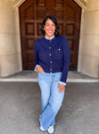 Classic with a playful twist, this button-front cardigan features a standout striped contrast ruffle collar and cuffs for a feminine touch. Designed with long sleeves, ribbed trim, and a front patch pocket, it’s the perfect blend of cozy and refined in a timeless navy hue.