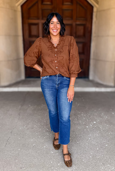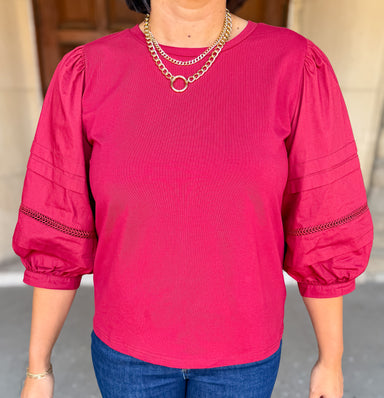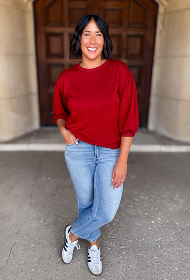 The Heidi 3/4 Balloon Sleeve Mixed Media Top is a perfect blend of comfort and style. This chic blouse features a classic crew neckline and a loose...