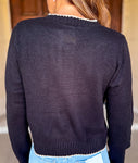 Delicate flower applique brings a touch of charm to this button-front cardigan, framed with contrast scallop edging for a sweet, feminine finish. Crafted in a soft knit with long sleeves, it’s a timeless layering piece in classic black.