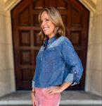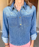A fresh take on a classic, this Western-style shirt features a sunwashed blue finish with front patch pockets, a pointed collar, and snap-front closure. Long sleeves with snap cuffs and a curved hem complete the laid-back, vintage-inspired look.