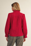 A timeless silhouette with feminine detail, this cotton poplin blouse features delicate eyelet trim, long puff sleeves with button cuffs, and a button-front closure. The pleated back yoke adds subtle shape and movement, making it an effortless piece to dress up or down.