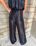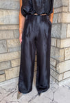 Sophisticated with a touch of shine, these high-waist pants feature a wide-leg silhouette with a pleated front for added movement and elegance. A hook-and-zipper closure with hidden elastic at the back waist ensures comfort and fit without compromising style. Finished with side pockets and a subtle shimmery black fabric, they’re the perfect blend of modern polish and wearability.