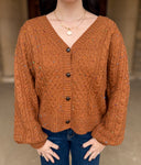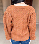 Cozy and charming, this cable knit cardigan features a flattering V-neckline and button-front closure for classic style. Designed with long balloon sleeves, slightly dropped shoulders, and finished with ribbed neckline, cuffs, and hem, it offers a relaxed yet feminine silhouette. A subtle confetti detail adds a playful touch to the soft almond hue, making it a versatile layering piece.