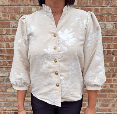 Romantic and feminine, the Azalea Jacquard Button Top features 3/4 puff sleeves and a delicate ruffle V-neckline for a soft, elegant touch. The but...