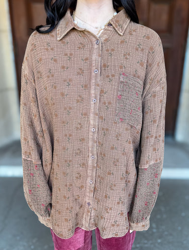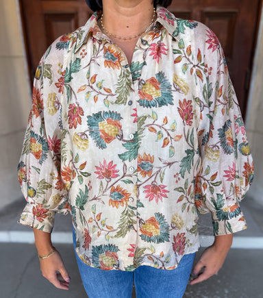 Introducing the Elise Floral Peasant Button Top, a perfect blend of romance and style. This enchanting top features soft fall florals that effortle...