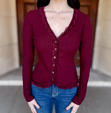 Flirty and feminine, the Joyce Lace Trim Ribbed Top features a flattering V-neckline accented with delicate lace trim. The button-down front and fi...