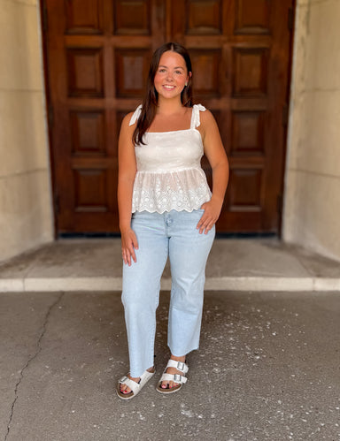 Pretty and polished with a breezy twist. This white cotton eyelet top features tie shoulders, a flattering peplum silhouette, and a scalloped hem f...