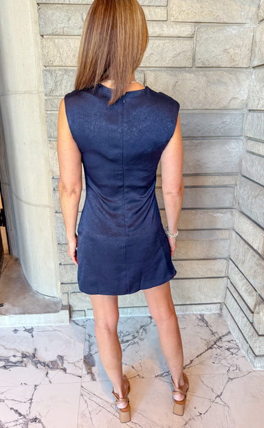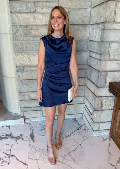 Sleek and sophisticated, this textured satin dress features a draped neckline and sleeveless silhouette for an effortlessly elegant look. Side ruch...