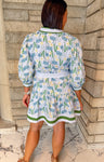 Introducing Elodie Floral Button Tie Dress, a stunning floral print dress that effortlessly combines elegance and comfort. Crafted from 100% cotton, this dress features a delightful V-neckline and a charming button front, making it perfect for any occasion. The 3/4 puff sleeves and contrast band trim add a touch of sophistication, while the tie waist accentuates your silhouette. The ruffle tier skirt flows gracefully, and the side pockets offer practicality without compromising style. Available in a serene blue, the Elodie Floral Button Tie Dress is your go-to choice for a fresh, fashionable look.