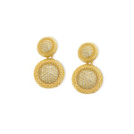 These earrings feature a mesmerizing dual-circle design, blending intricate texture with radiant sparkle. Each circle showcases a lattice-like pattern that adds dimension and refinement, while the center glows with a cluster of brilliant cubic zirconia stones.