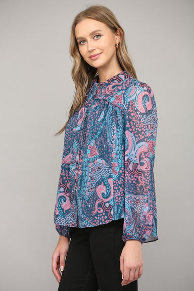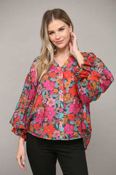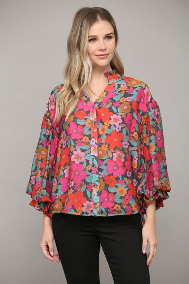 Add elegance to your wardrobe with the Lillian Floral Ruffle Sparkle Top. This top features a beautiful floral print with subtle sparkle accents, a...
