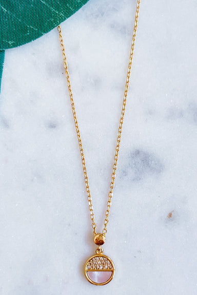 Cubic zirconia and Mother of Pearl 10mm pendant 15-17" Adjustable chain length Clasp closure Gold plated brass