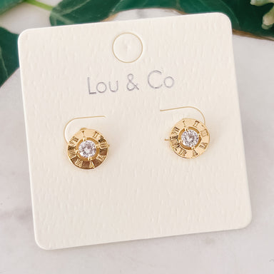 Gold/Rhodium plated brass Cubic zirconia Etched roman numerals .25" Post