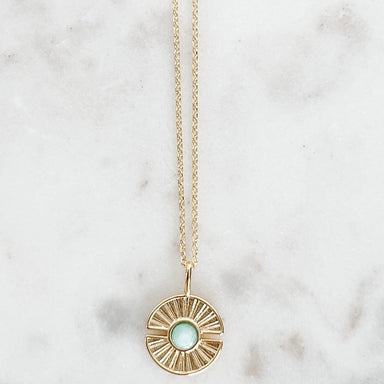 Tiny o chain necklace with natural stone sunburst pendant with cubic zirconia stud. Material: 18k gold plated, triple plated Stone: Cubic zirconia,...
