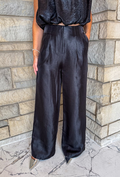 Sophisticated with a touch of shine, these high-waist pants feature a wide-leg silhouette with a pleated front for added movement and elegance. A h...