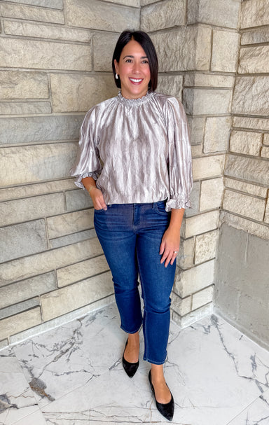 Delicate and romantic, this champagne-colored top features a smocked ruffle neckline and crinkle-textured fabric for soft movement and charm. Long ...