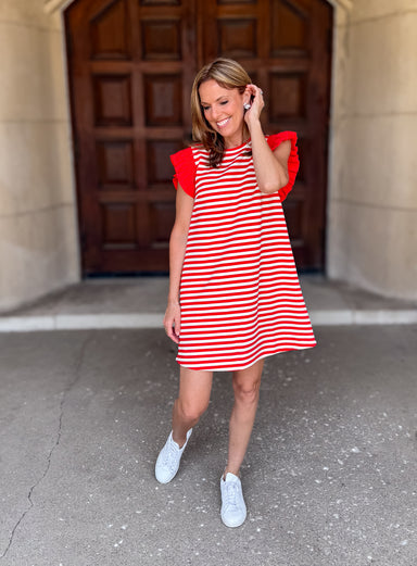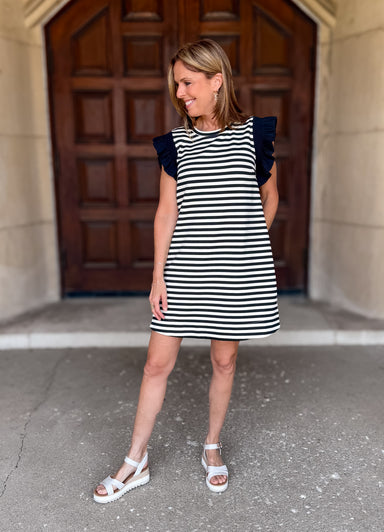 The Cassie Striped Button Top is the perfect blend of sophistication and playfulness. This high neck blouse features a unique ruffle collar and a b...