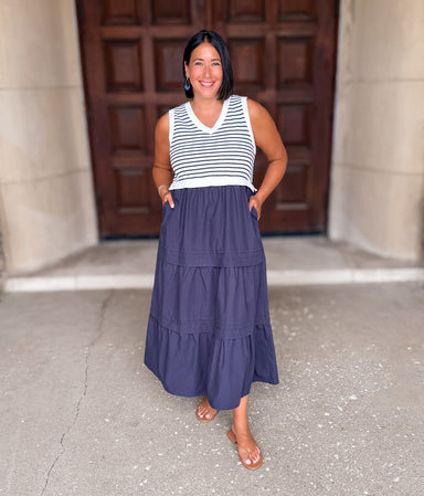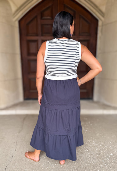 Classic stripes meet playful detailing in the Jenny Striped Contrast Trim Sweater, designed with long sleeves, a round neckline and contrast stitch...
