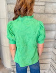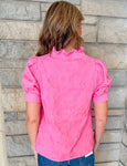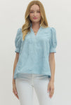 The short puff sleeves create a flattering, feminine silhouette, balanced by a tailored band cuff that adds subtle structure. This thoughtful detail keeps the sleeves feeling refined rather than oversized, making the top easy to style for both casual and dressed-up occasions. At the neckline, a mini ruffle split V-neck adds just the right amount of softness and charm, framing the face beautifully while remaining easy and wearable.