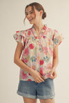 Introducing the Camila Floral Pleated Button Top, a stunning floral print top that effortlessly combines style and comfort. Crafted from 100% cotton, this piece features a pleated ruffle V-neckline and scallop trim detail, making it perfect for any occasion.