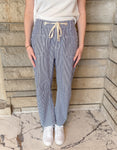 The grommet drawstring waist ensures a customizable fit, while the zipper and button fly provide practicality. With both front and back pockets, these pants are as functional as they are fashionable. Made from 65% cotton and 35% polyester, they offer breathability and ease of care. Available in a trendy denim color, the Carol Striped Barrel Pants are a must-have for the fashion-forward individual.