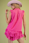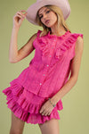 The Ella Eyelet Ruffle Shorts Set is a charming addition to any wardrobe, designed for comfort and style. This set features a round ruffle neckline and sleeveless design, making it perfect for warm weather.