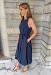 The bubble hem adds a playful touch, while the self-tie belt accentuates your waist for a flattering silhouette. Available in a timeless navy color, the Linda Tie Waist Bubble Dress is a must-have addition to your wardrobe.
