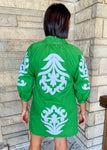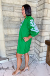 Featuring a high ruffled V-neckline and decorative pearl button front and cuffs, the design is both eye-catching and refined. The 3/4 raglan sleeves add a touch of modernity, while the side pockets provide practicality. Available in a vibrant Kelly Green, this dress is perfect for various occasions, making it a versatile choice for fashion-forward individuals.