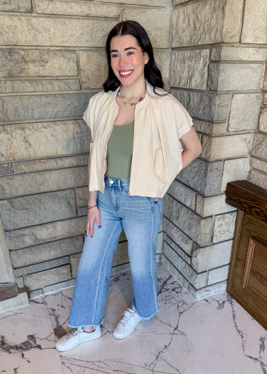 The perfect layer for breezy days. This cream-colored jacket is made from a soft, textured fabric that feels light and airy. It features a zipper f...