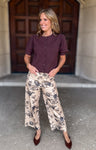 Chic and versatile, these mid-rise pants feature a delicate floral print and a flattering ankle-length cut. Designed with a button zip-fly closure and functional patch pockets at the front and back, they combine style and practicality. Crafted from a soft cotton-spandex blend for comfort and a slight stretch, in a warm taupe hue.