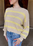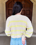 Brighten your day with this Rowan Striped Knit Sweater in lively natural lime. This cozy yet lightweight piece features a classic crewneck, long sleeves, and drop shoulders for a relaxed, effortless fit. The shorter length adds a modern touch—perfect for layering over high-waisted jeans or skirts. Bold stripes infuse playful energy, while the soft knit keeps you warm without weighing you down.