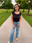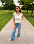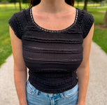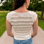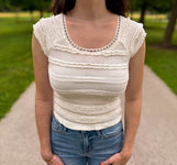 Delicate details meet a timeless silhouette in this charming scoop neck top. Featuring a woven ribbon trim along the neckline and cap sleeves for a feminine touch, it’s finished with ruffle lace accents that add soft texture and elegance. The shorter length pairs perfectly with high-waisted bottoms, while the subtly stretchy, textured fabric ensures a comfortable fit with a refined feel.