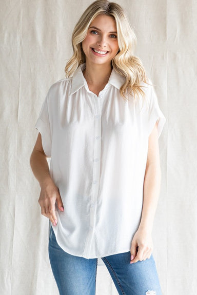 Collared Neckline Buttons Pleated Shoulder Detail Cuffed Sleeve Back Shirring Detail Lightweight Rounded High-Low Hemline 100% Polyester Hand Wash...