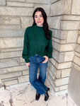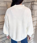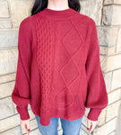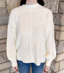 Featuring a crew neckline and intricate cable knit detailing, this sweater combines comfort with style. The dropped shoulder and balloon sleeves add a trendy touch, while the ribbed cuffs ensure a snug fit.
