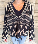 A cozy statement with eclectic flair—this Morgan Patterned Shawl Collar Cardigan blends classic comfort with modern character. In a versatile black and taupe palette, it features long sleeves and a V-neckline framed by a soft folded collar. The snap button front offers ease of wear, while side pockets and a drawstring toggle hem add both function and a relaxed vibe. Crafted from a warm, textured blend of acrylic and wool, it's designed for a laid-back fit that layers effortlessly over everyday looks.